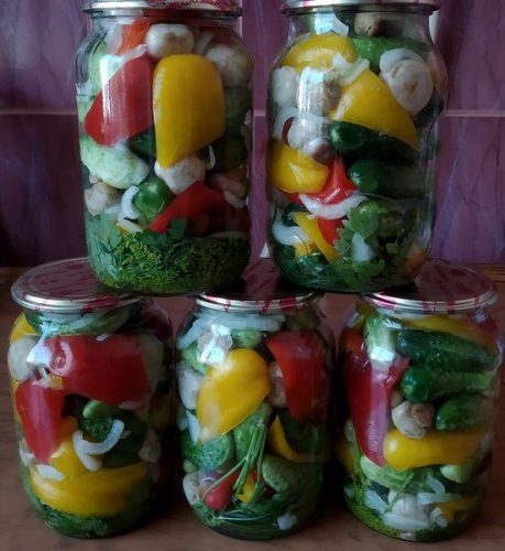 Все хорошо перемешать, чтобы растворилась соль. Овощи замочить в соленой воде на 2 часа периодически помешивая. Через 2 часа сливаем воду. На дно банки кладем петрушку, укроп и заполняем банки салатом. Заливаем горячим маринадом и стерилизуем 0,5л банка 10мин., а 1л банка 15 мин.