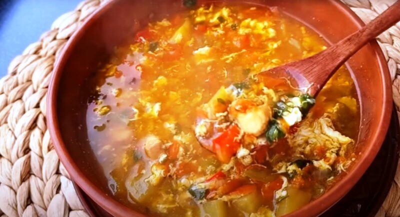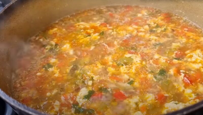В отдельной миске надо взбить яйца, тонкой струйкой вылить в суп и перемешать. Остается варить похлебку еще примерно 5-10 минут.
