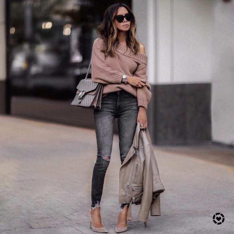 Повседневный образ можно составить с узкими серыми брюками скинни, которые очень выгодно будут сочетаться с толстовками, свитерами over size, куртками-косухами из кожи или замши.