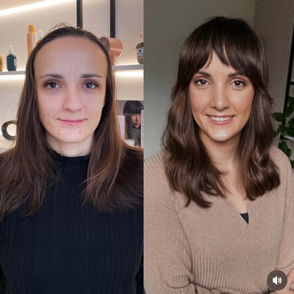 У клиентки были очень густые волосы сзади и редкие по бокам и над лбом. Многослойная стрижка и грамотная укладка – идеальное решение!