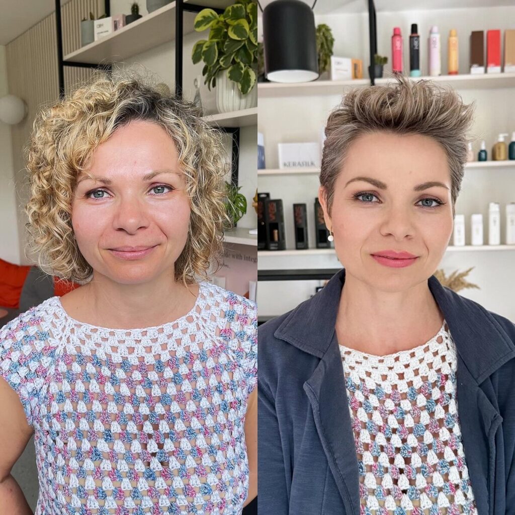 Женщинам с седыми волосами желательно добавить красный или розовый пигмент в свой макияж. Стрижка пикси чудесно смотрится на коротких прядях.