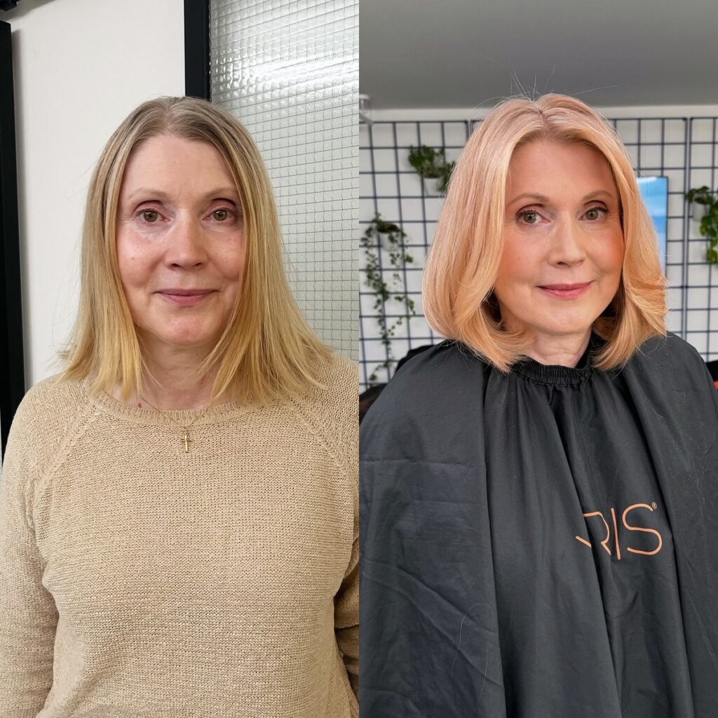 Женщина часто носит одежду в темных тонах, редко пользуется косметикой. Важно было скрыть мимические морщинки и мастер прекрасно справился с поставленной задачей. Пшеничный блонд освежает зрелую внешность.