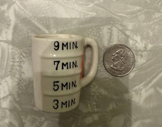 Это из винтажного набора для электро-яйцеварки: кружка отмеряет, сколько воды нужно добавить в зависимости от времени варки