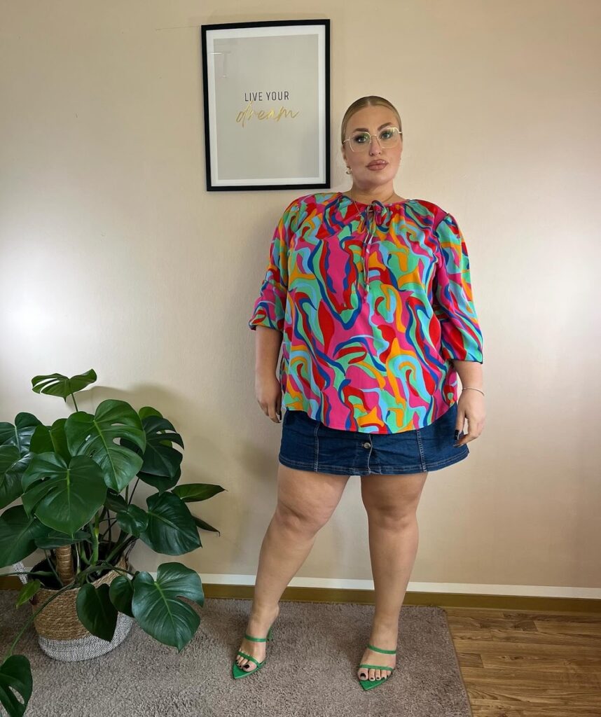 Первое, на что стоит обратить внимание — рубашка или блуза без акцента на талии. Конечно, умеренный оверсайз — это неплохо. При грамотном подходе он позволяет скорректировать фигуру и скрыть всё лишнее. Например, спущенный рукав не подчеркивает объём плеч, а с помощью свободного кроя можно сформировать фигуру “песочные часы”. Но этим нужно правильно управлять, ведь иначе получится как на фото.