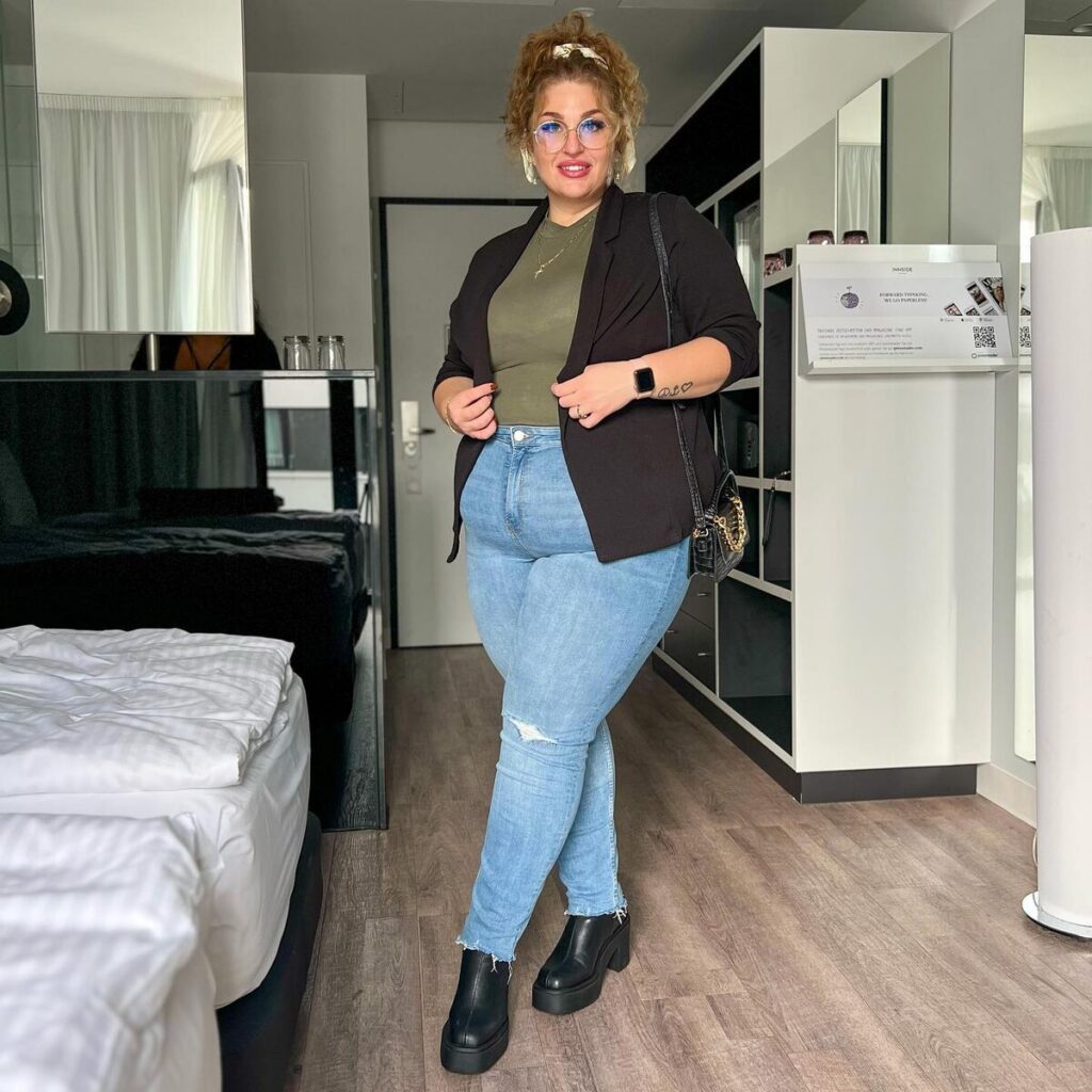 Многие дамы плюс сайз боятся носить оверсайз, ведь уверены, что он их только полнит. Но как только вы обозначите линию талии, фигура сразу выглядит стройнее. Причём, не обязательно покупать специальный ремень или бежать за новой приталенной рубашкой. Достаточно заправить хотя бы один борт в джинсы на высокой посадке и пропорции уже смотрятся гармоничнее.