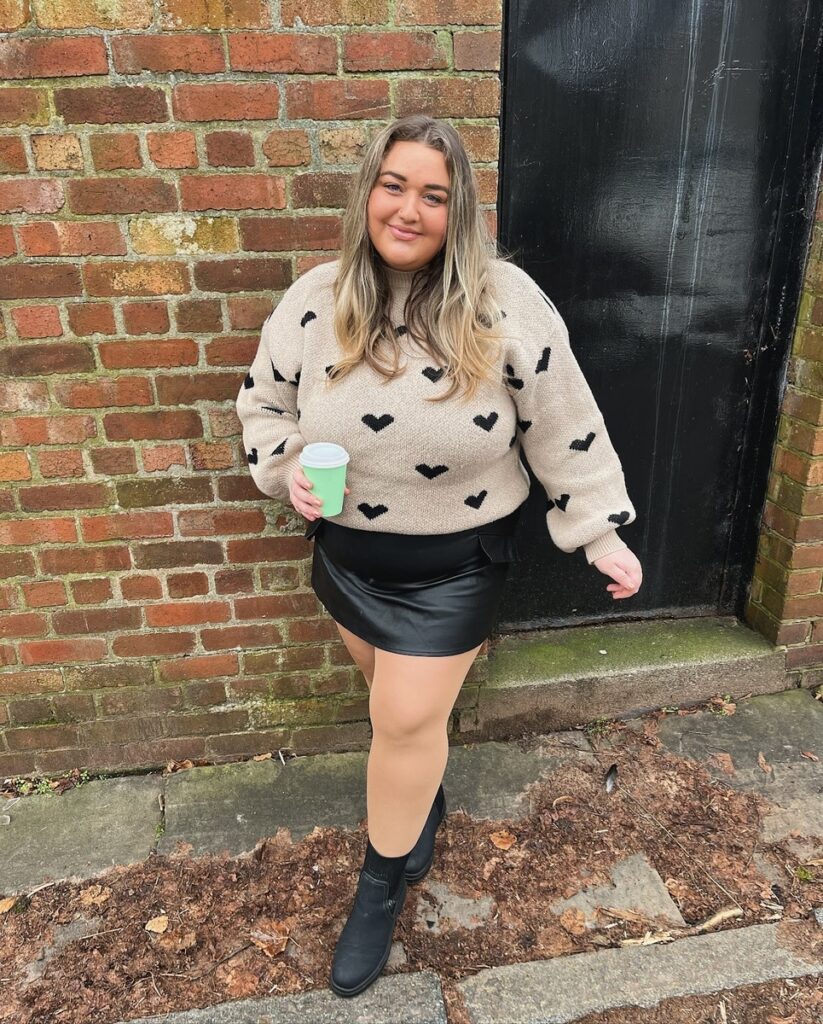 Рукава слишком длинные, поэтому запястья, добавляющие образу лёгкость, прикрыты. Длина свитера — тоже мимо. Гораздо выгоднее для фигуры заправить его в брюки или юбку с высокой посадкой. Только следить за тем, чтобы юбка не была атласная или шёлковая — так свитер только добавит объем на животе.