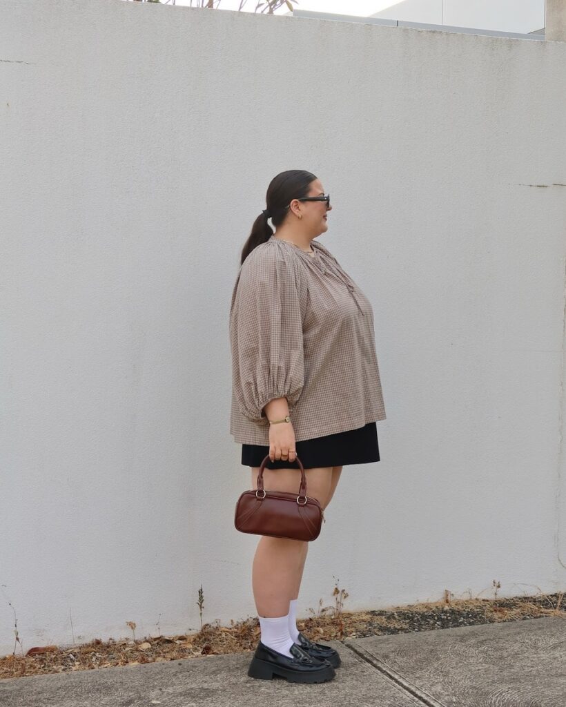 В сочетании с мини юбкой — особенно неудачное комбо. Ноги кажутся короткими, так как визуально обрезаются аж в 4 местах (лоферы, носки, юбка и низ блузы), а живот — излишне большим.