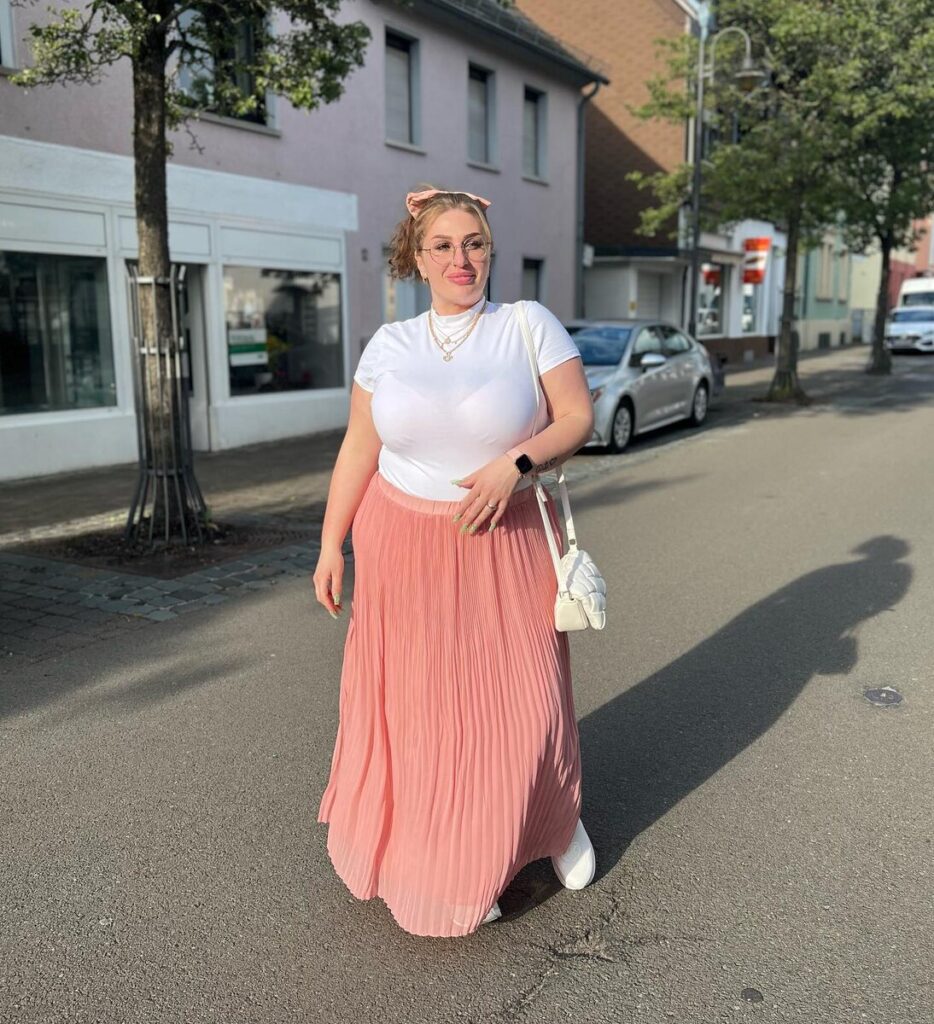 Идеальный вариант — юбка ниже колена или мидакси. Главное, чтобы она не заканчивалась на самых широких участках ног — бедрах, голенях и посередине колена.