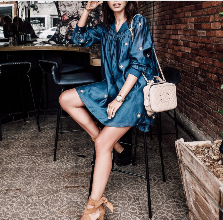 Это пастельное розовое платье сочетает в себе сразу несколько трендов 2019. Здесь есть и легкая ткань, и свободный крой, и широкий рукав, и заниженная талия, и длина мини, и складки. Обратите внимание: эта модель, несмотря на глубокий вырез и длину мини, выглядит нежно и женственно, а не вызывающе.
