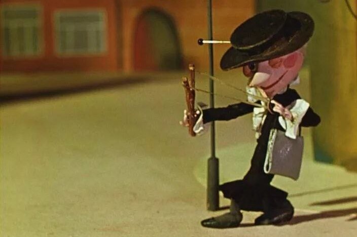 Именно в такой шляпке и ходила старушка Шапокляк, но носить убор она предпочитала исключительно в сложенном виде. Ни в одном кадре владелица крысы Ларисы не появляется без плоской шляпы с длинными булавками.