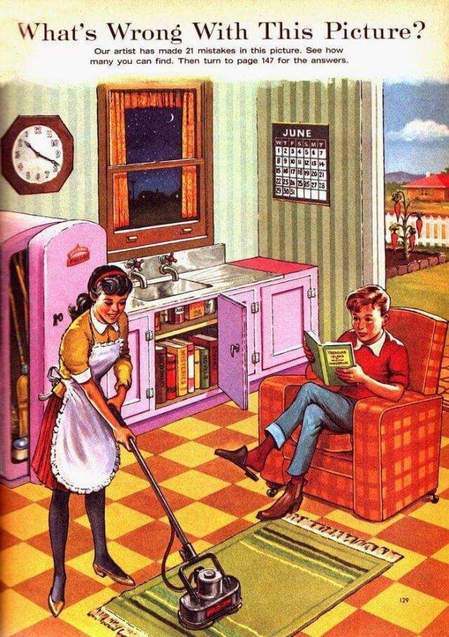 На картинке мы видим мирно обедающую семью. Папа, мама, пятеро детей. Однако, стоит присмотреться, сразу понимаешь: какие-то они подозрительные. Как будто инопланетяне прибыли на Землю в 50-х годах XX века и пытаются замаскироваться под местных. Изображение насчитывает минимум дюжину странностей, и я предлагаю вам их поискать. Это хороший тест на наблюдательность, прекрасная встряска для мозга, который точно проснется от изобилия «неправильного».