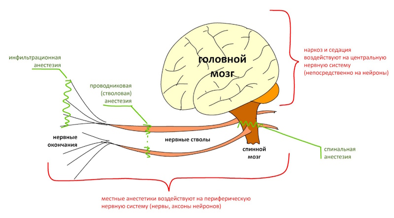 Местная анестезия блокирует болевые сигналы в определенной части тела. Боль, как и другие сигналы, проходит по нервной системе в виде электрических импульсов. Местные анестетики создают для этих сигналов преграду, связываясь с белками в мембранах нейронов, которые пропускают заряженные частицы внутрь и наружу клеток, блокируя положительно заряженные ионы.