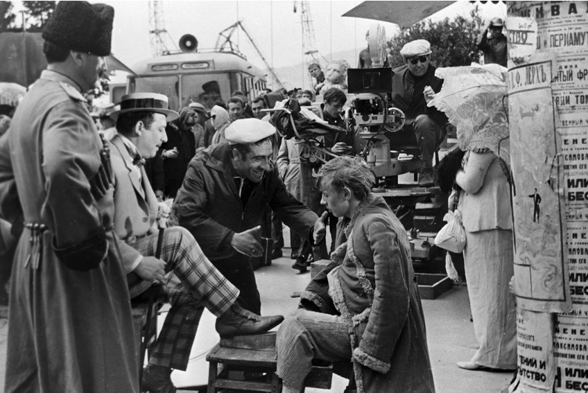 Борис Сичкин (второй слева) и Виктор Косых (справа) на съемках фильма «Новые приключения неуловимых», 1968 год