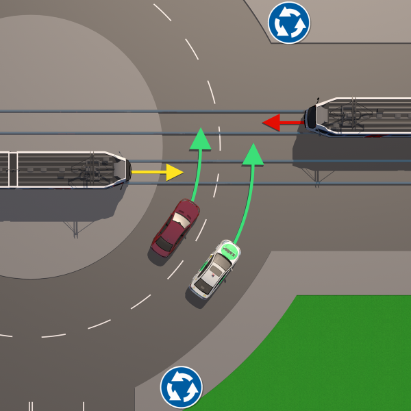 Таким образом, в этом случае трамвай пересекает дорогу с круговым движением дважды, выезжая и заезжая, и уступает дорогу соответствующим образом.