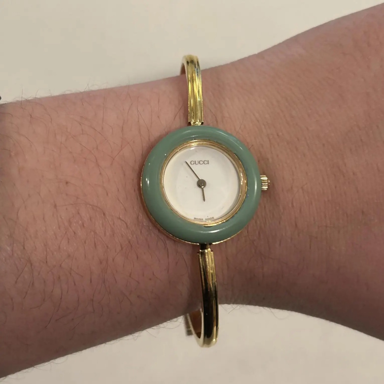 При этом девушка продемонстрировала ювелирное изделие люксового бренда с ободком мятного цвета на циферблате и золотым креплением.