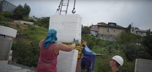 Летом такие элементы можно привозить на объект уже через 1-3 дня. Зимой нужно выдерживать неделю. И там их стрелой манипулятора собирают в стены, как конструктор, устанавливая на клей-пену.