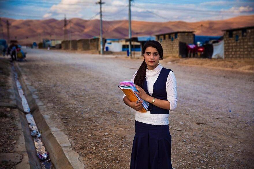Молодую езидскую девушку из Курдистана фотограф встретила в лагере беженцев в Ираке. Хасе повезло, что она жива и может учиться. К сожалению шесть ее маленьких кузенов были убиты при нападении на деревню в Сирии.