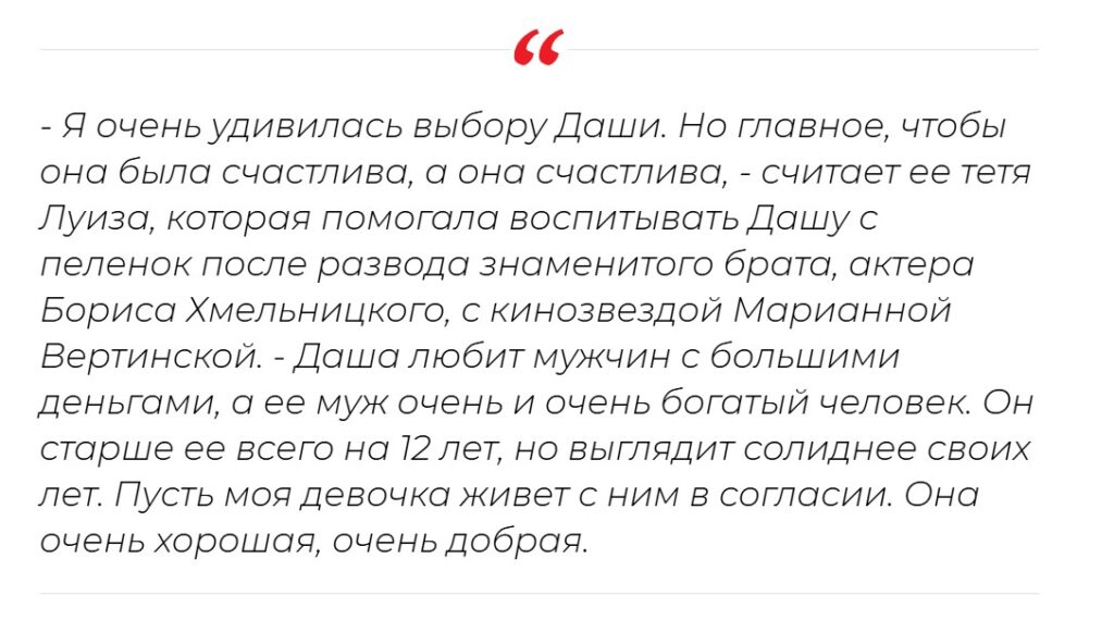 В 2011 году Дарья родила дочь, правда, отца дочки она тщательно скрывает. Она не распространялась о личной жизни. Но Дарья впервые вышла замуж. В Сети появились редкие кадры. Избранник – элитный стоматолог, который врачевал самого Бориса Березовского. Пара познакомилась в общей компании. Супруг старше Дарья всего на 12 лет.
