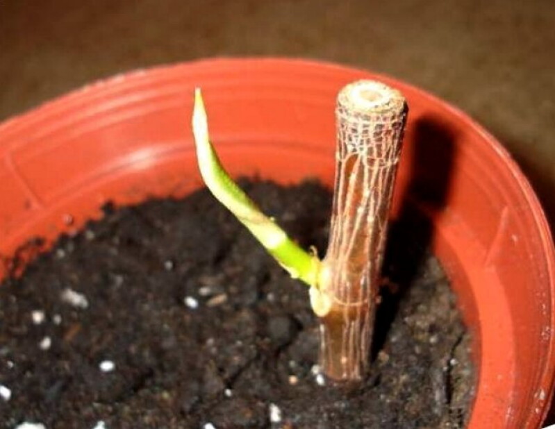 Горизонтальное укоренение. Этот способ отличается тем, что стеблевые черенки не втыкают в субстрат, а выкладывают их горизонтально на влажный грунт, слегка вдавливая их. Сверху черенки необходимо прикрыть пакетом, чтобы создать условия теплички. По мере роста побегов укорененный кусочек стебля начнет разрушаться, поскольку все питательные вещества уйдут на образование корней и молодых отростков.