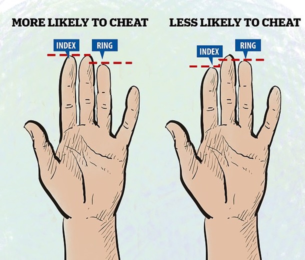 Биологи из Оксфорда выяснили, что женщины, у которых на левой руке указательный палец длиннее безымянного, более склонны изменять. Исследование было опубликовано в журнале Biology Letters.