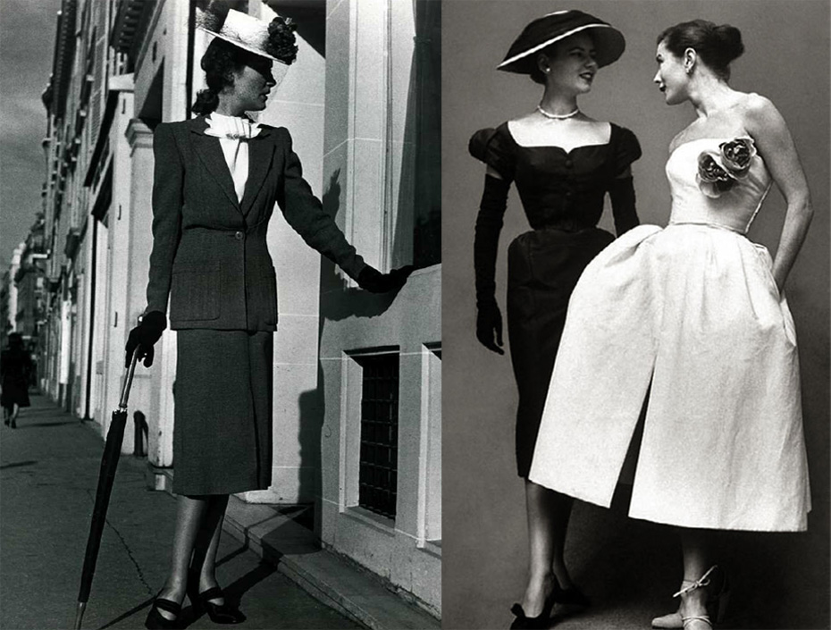 Благодаря Диору женщины снова облачились в корсеты и пышные юбки. Обувь тоже стала более женственной: в основном, предпочтение отдавалось остроносым лодочкам или мюли. Все три фасона, на которых базировался стиль new look (овальный силуэт, А-силуэт и Н-силуэт), выглядели элегантно и дорого, и, конечно же подчеркивали изящность фигуры.