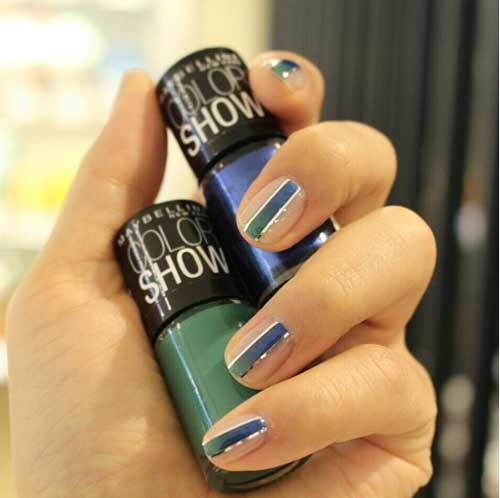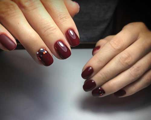 Цвета, которые следует использовать: фиолетовый, вишневый, насыщенно–красный, шоколадный и другие. Хорошо, если будут вертикальные отблески-полоски (как в примере выше), просто полосатый вариант маникюра или контрастные цветовые сочетания.