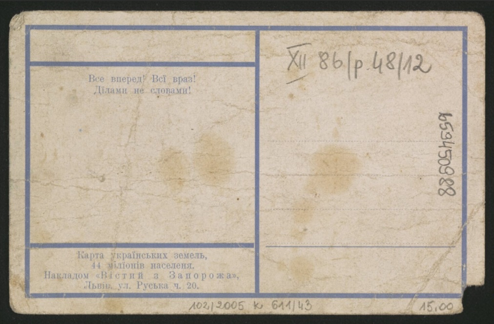 На реверсе надпись: Все вперед! Все сразу! Делами не словами!”; и: «Карта Украинских земель, 44 млн. населенная». Также указано, что открытка была напечатана во Львове: Тиражом «Известия из Запорожья», с 1905 ул. Русская, ч. 20.
