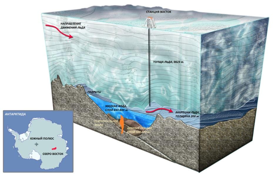 К 2007 году на самом южном материке насчитали 140 подлёдных озёр. Учёные считают, что вода в них была изолирована от внешнего мира миллионы лет, и там могут существовать уникальные формы жизни. Хотя есть подсчёты, что вода в Востоке должна полностью обновляться за 13 300 лет: часть «уносит с собой» движение накрывающей плиты-ледника.