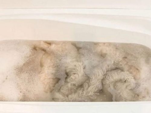 Наполняем ванну теплой водой, таз не подойдет, ведь в него ничего не поместится. Вода должна быть именно теплой, не более 40 градусов. В противном случае можно нанести вред ткани.