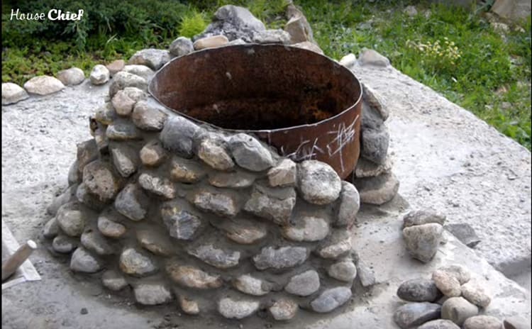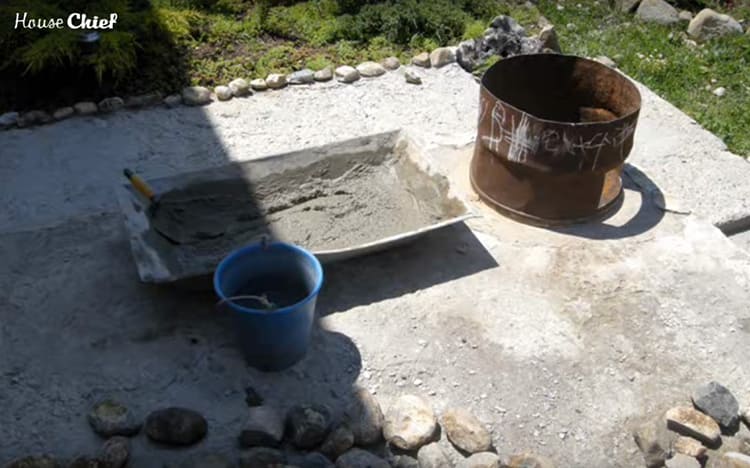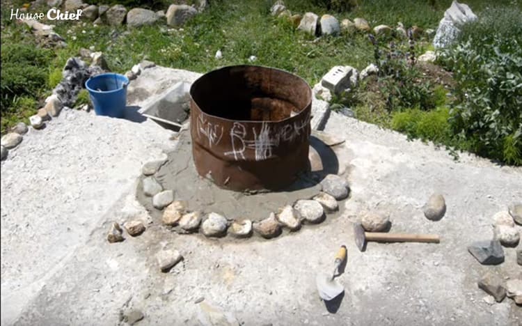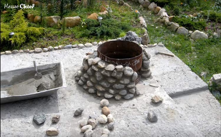 Первый ряд камней положили на расстоянии примерно в 30 см от бочки, а  внутреннее пространство залили бетоном