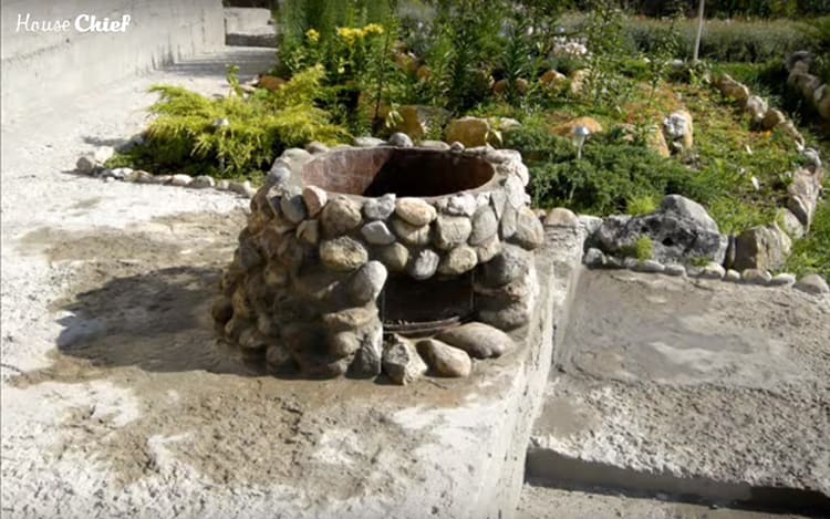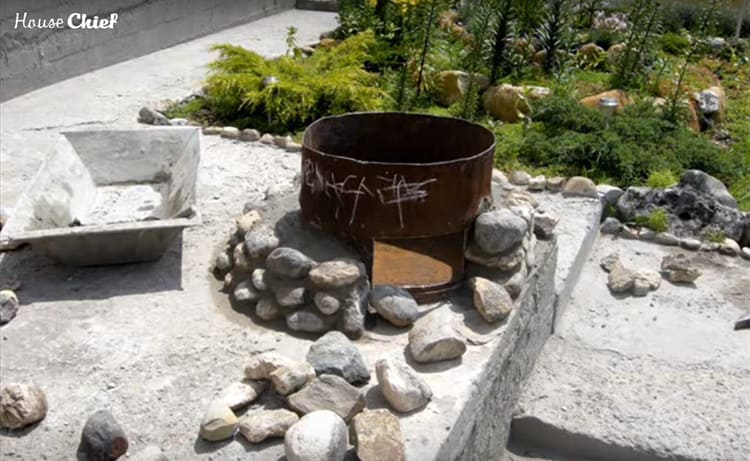 На всю работу по созданию этой конструкции у нас ушёл всего один день. С утра разрезали бочку и принесли камни – после обеда всё сложили. Две недели очагом не пользовались, пока бетон набирал крепость. Я даже думаю, что когда металл совсем рассыплется внутри, ничего страшного не случится: мы можем вложить туда новую бочку или вовсе пользоваться очагом из камней без вкладыша.