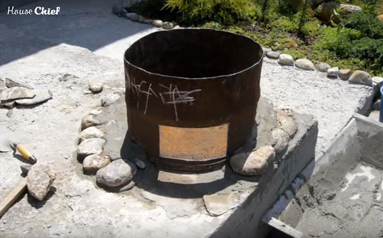 Бочку решили обкладывать не к самым стенкам, а под наклоном. Так очаг будет лучше выглядеть, а кроме того, не будет риска обжечь ноги при подходе к нему.