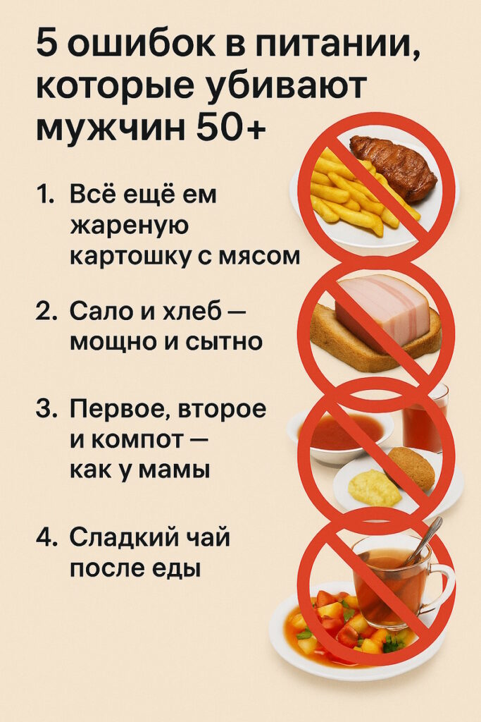 После 50 лет жизнь у мужчин часто идёт по сценарию: уха на завтрак, сало с чесноком на обед, борщец с картошкой и копчёностями вечером. Всё бы ничего, но через 10 лет — инсульт. И пока врачи машут рукой, а таблетки заполняют прикроватную тумбочку, самое время взглянуть на тарелку и честно сказать: что я кладу туда каждый день?