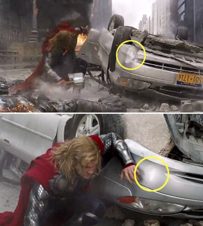 5. «Мстители» часть первая. Все рушится, везде осколки и пыль, а также помятая машина, которая в сцене с Тором, внезапно восстанавливает свой бампер. Чудо, не иначе.