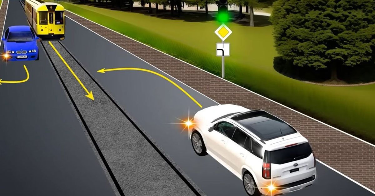 То есть белый автомобиль, поворачивая налево, обязан уступить дорогу трамваю. Что же делать с синим автомобилем, поворачивающим направо? Следует вспомнить другой пункт ПДД, а именно 16.6. Так, при повороте налево или развороте, водитель обязан дать дорогу транспортным средствам, что движутся в попутном направлении или поворачивают направо.