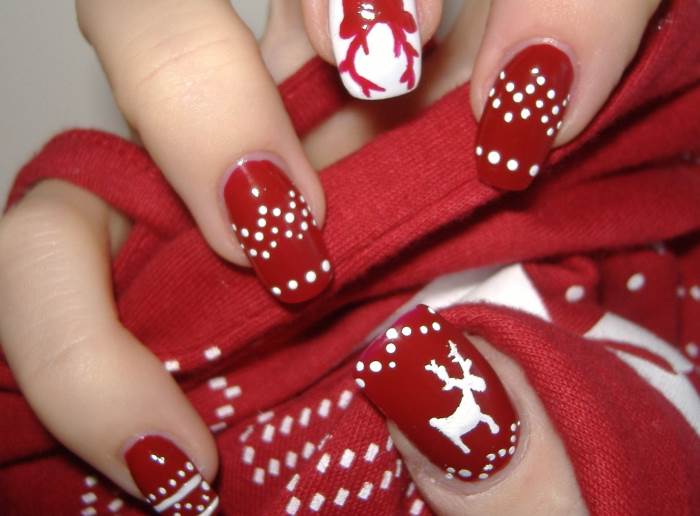 Торжественности маникюру способны прибавить стразы, блестки и тематические принты (например, белые снежинки на красном фоне). Золотые и серебряные стразы и блестки являются замечательным дополнением к классическому красному маникюру.