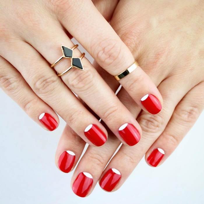 Лунный маникюр со светлой или красной лункой смотрится, как минимум, романтично. Не стоит стороной обходить декор – белое кружево на красном фоне идеально подойдет для придания элегантности.