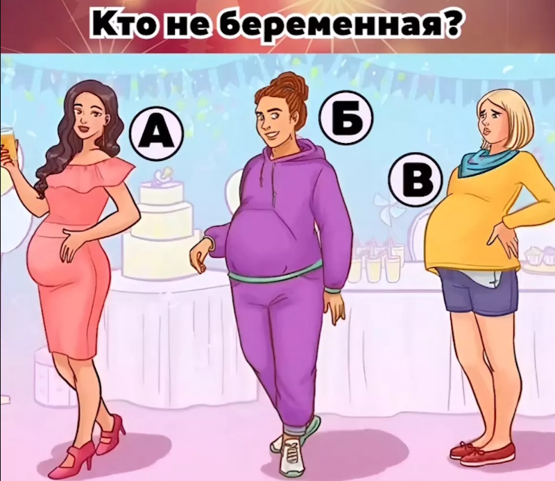 Под буквой Б — в спортивном костюме, тоже с внушительным животом. Под буквой В — девушка с большим животом, в шортах и свободном свитере.