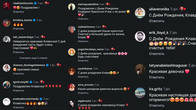 “Без лимузинов, циркачей и брендовых шмоток. Они выше всей этой мишуры и пафоса”, “Красивая девочка выросла”, “Помню, как звезды- молчуны пресмыкались перед Аллой и ее семьей, как они лебезили, как старались попасть в их круг”, “Просто шикарная девочка, будущая модель”, — прочитала я в комментариях под новыми кадрами семьи Орбакайте.