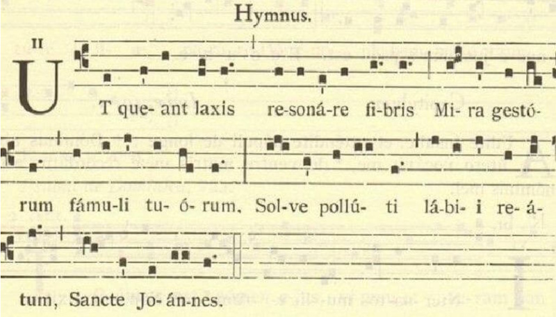 (В переводе с латинского: «Чтобы слуги твои голосами своими смогли воспеть чудные деяния твои, очисти грех с наших опороченных уст, о, Святой Иоанн»)