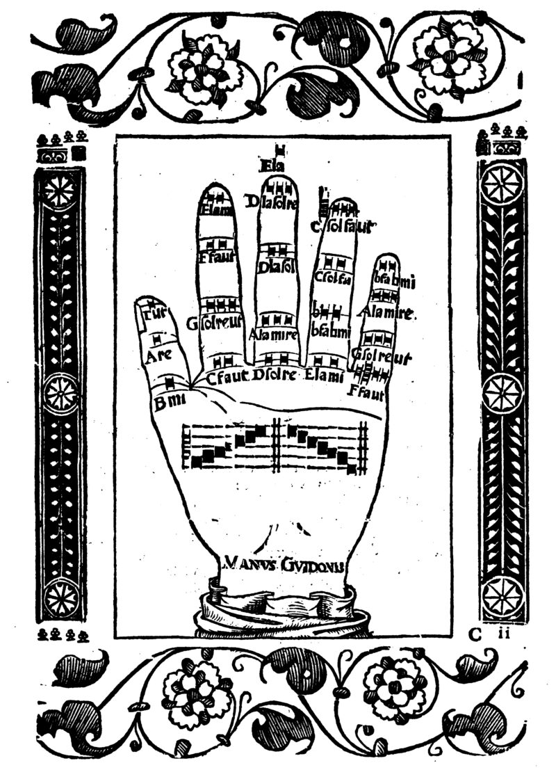Помимо всего прочего, Гвидо принадлежит и огромная заслуга в прогрессе письменной части нотной грамоты. Во время выступления хора, Гвидо для указания нот использовал свою левую руку, сгибая суставы пальцев он указывал, какую ноту брать в то или иное время: