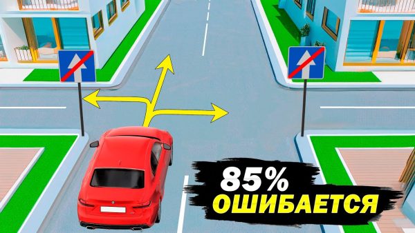 Этот знак указывает, что водитель красного автомобиля правомерно находится в левой полосе, так как движется по дороге с односторонним движением. Однако после пересечения перекрёстка одностороннее движение сменится на двустороннее, а значит: