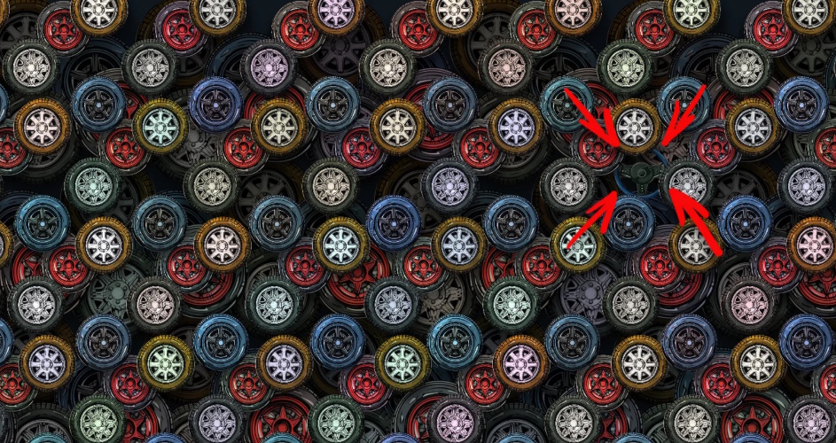 Присмотритесь повнимательнее и скажите, где среди обутых в резину дисков завалялся руль от машины. Можете гордиться своей внимательностью и зорким зрением, если сможете проделать это меньше чем за 10 секунд.