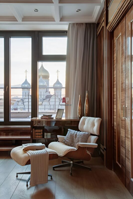 Андрей, как истинный ценитель литературы, не мог не выделить для себя уголок для чтения. В доме есть большая библиотека, где он может погрузиться в книги в своем любимом кресле.