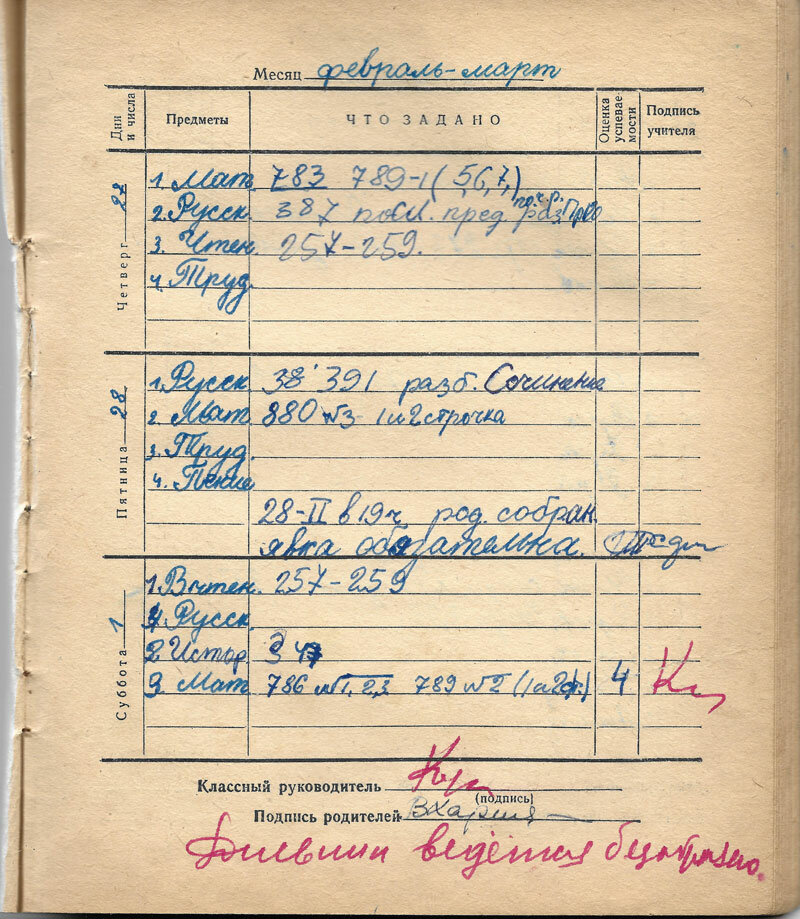 К февралю вести дневник надоедает, видимо, поэтому запись — «дневник ведётся безобразно».