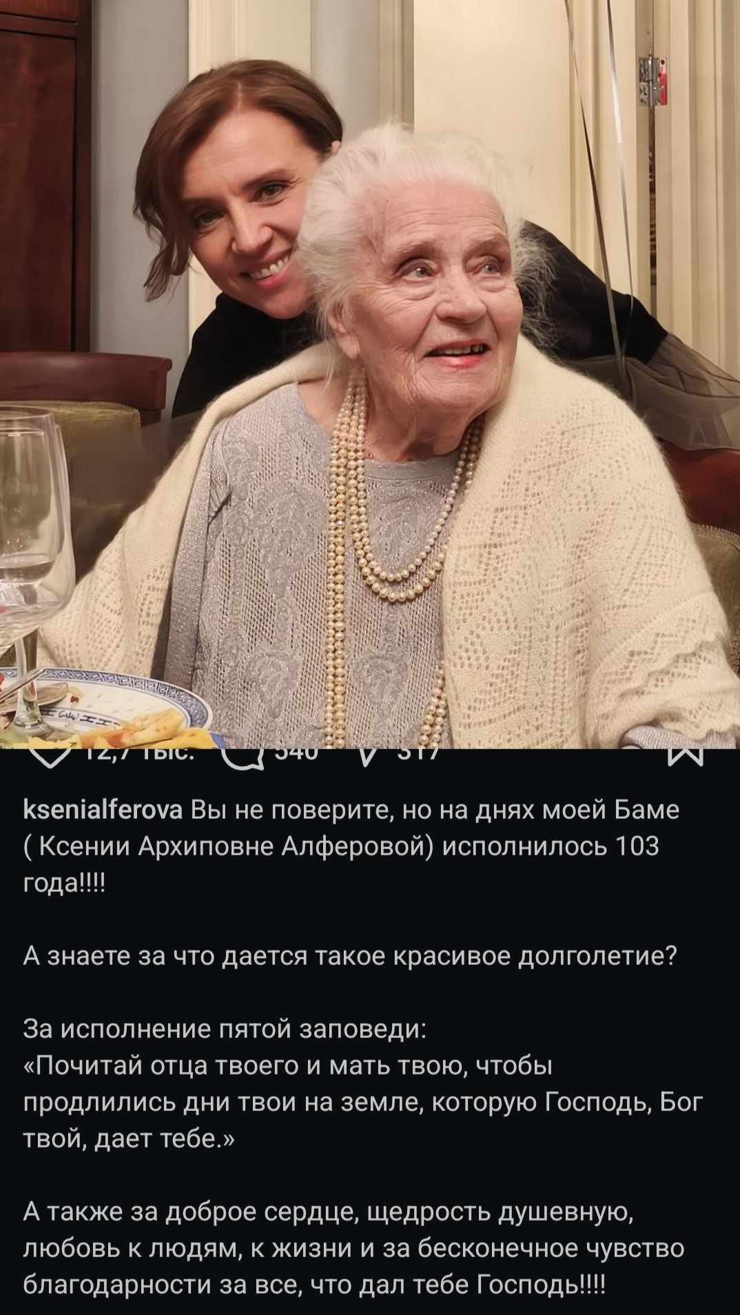 73-летняя Алферова показала 103-летнюю маму в честь ее Дня рождения. Ксения Алферова обратилась к пользователям Сети: “А знаете, за что дается такое красивое долголетие?”.