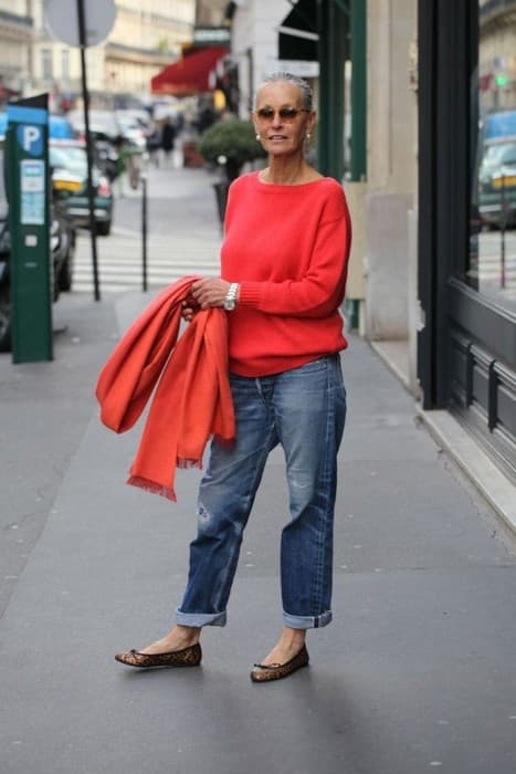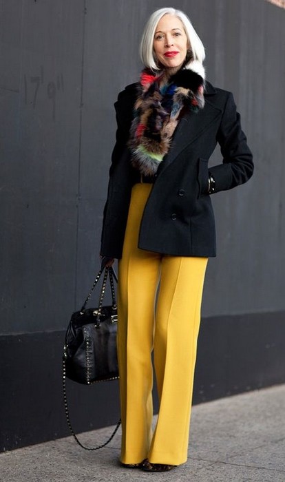Правильно подобранный яркий акцент смотрится идеально в любом возрасте. Во многом женщины привыкли пользоваться темными тонам, которые прибавляют возраст. Многим кажется, чем старше, тем более непозволительно использование ярких расцветок, но это большое заблуждение. Главное, чтобы цвета были подобраны гармоничны. Конечно, в синих брюках, малиновой кофте и оранжевых туфлях вы будете смотреться как попугай, но сочетание желтых (весьма модного в этом сезоне цвета) брюк и черного пиджака, или красной кофты с подвернутыми джинсами будут смотреться стильно и уместно. Ярким в образе должен быть лишь один предмет.