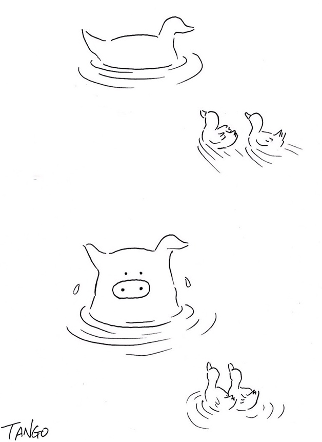 Рисунки Танго Гао, конечно, хочется рассматривать! Минимум красок, в основном чёрно-белые картинки, изначально кажутся простыми и незамысловатыми. Но это лишь на первый взгляд. Каждый сюжет так и «просится», чтобы зритель зацепился взглядом, внимательно присмотрелся и…. с улыбкой разгадал загадку.