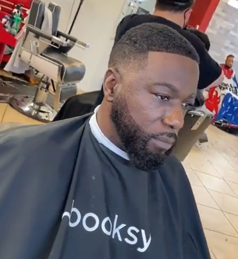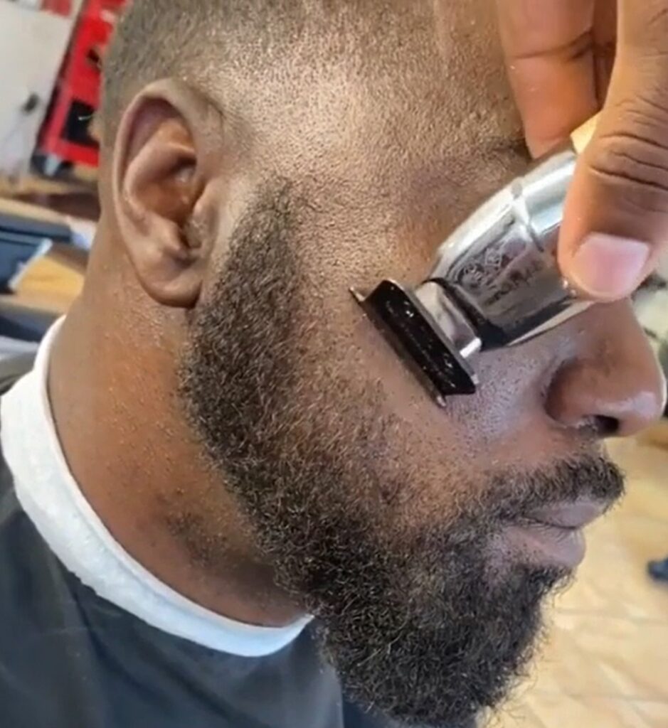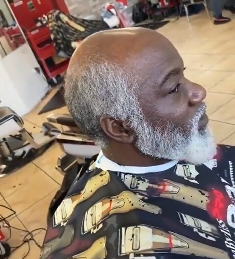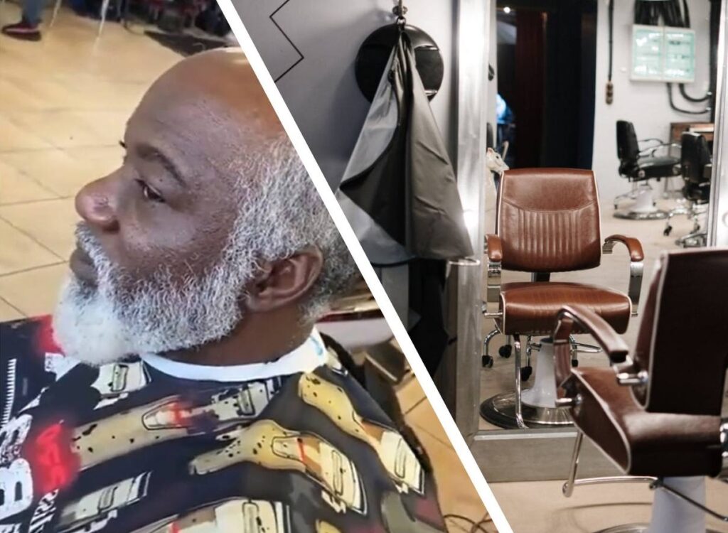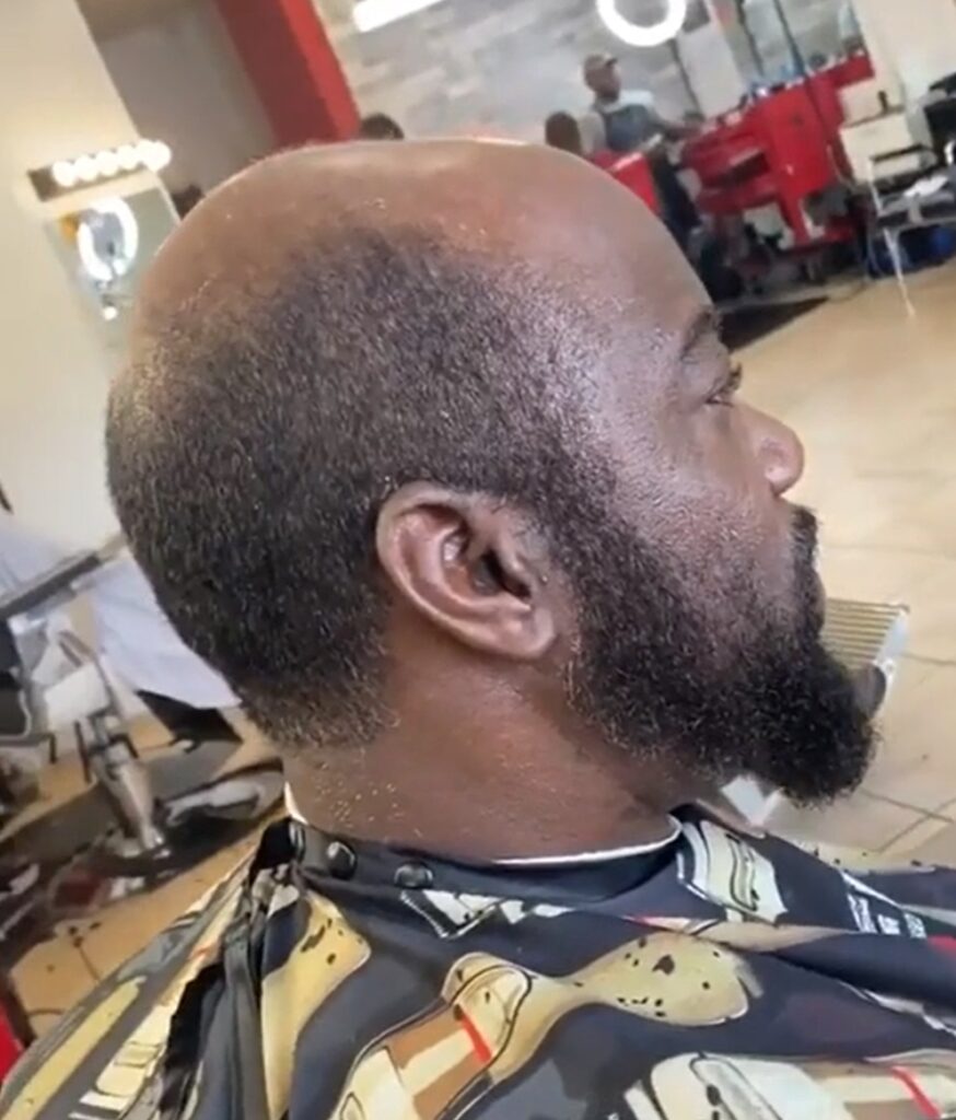 Парикмахер производит наращивание волос на облысевшие участки и выравнивает бороду, а после демонстрирует полученный результат.
