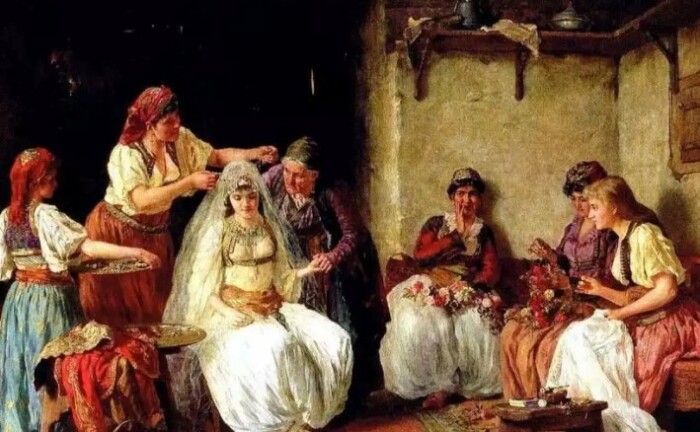 Более того — дружка, оставленный у дверей в качестве стража, время от времени понаведывался узнать — «случилось» или нет? А наутро уставших молодых людей нередко будили, окатывая холодной водой. Море, как говориться, удовольствия!